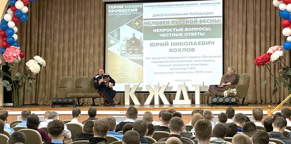 4 марта в стенах Курского железнодорожного техникума состоялась дискуссионная площадка, спикером которой выступил Юрий Хохлов — экс-депутат Народного Совета Луганской народной республики, ополченец, горный инженер-электрик, волонтёр СВО, выпускник техникума 1979 г., член Ассоциации «Соколы Маргелова».