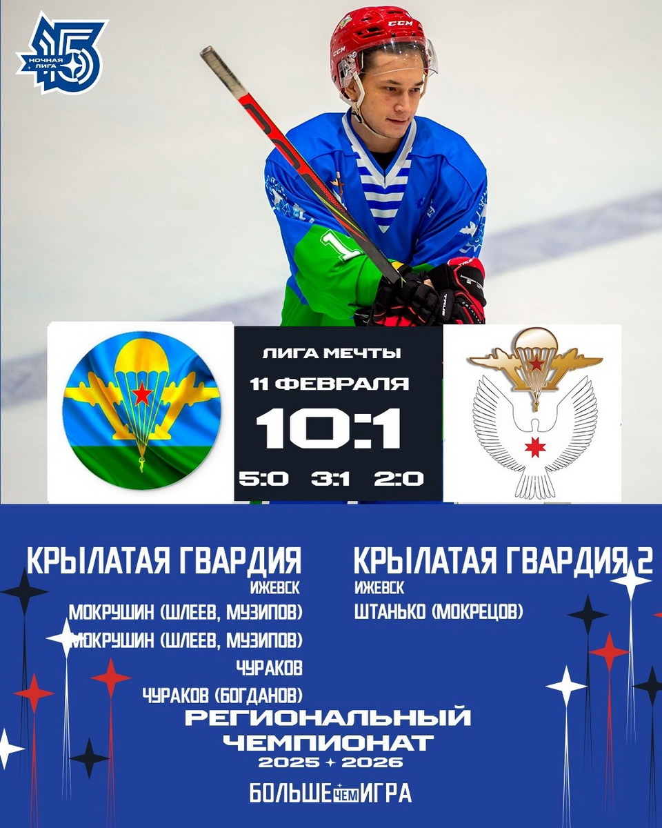12 февраля в ледовом дворце «Олимпиец» города Ижевск состоялась заочная встреча двух наших команд «Крылатая Гвардия 1» — «Крылатая Гвардия 2» … Номинальный хозяин арены одержал убедительную победу со счетом 10;1.