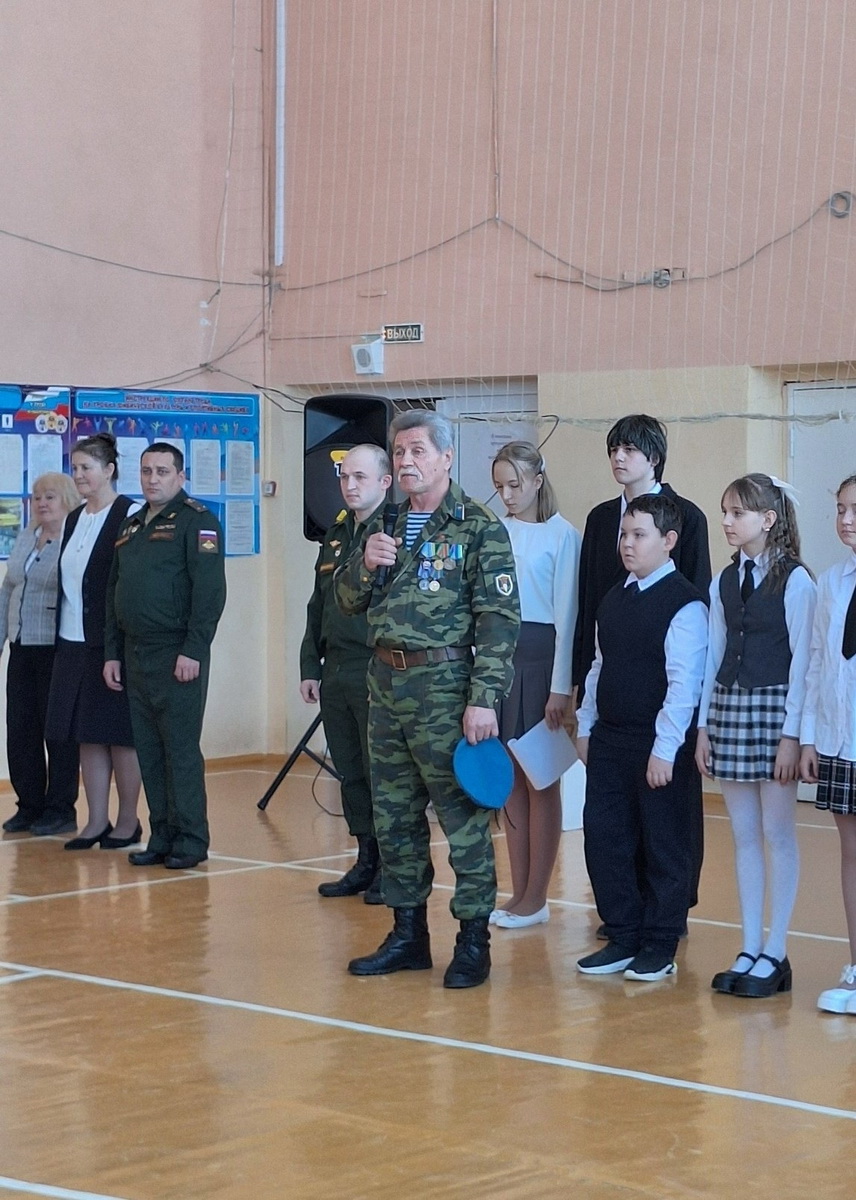 Ветераны ВДВ поздравили присутствующих с открытием месячника и пожелали будущим защитникам Родины воспитывать в себе силу воли, любовь к ближнему и к Родине. Присутствующие почтили минутой молчания память погибших героев СВО, выпускников школы.