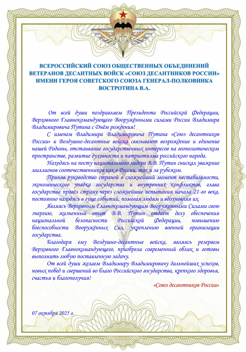 На прошедшей 13 декабря 2023 года конференции общественные организации - члены Всероссийского союза общественных объединений ветеранов десантных войск «Союз десантников России» выразили единогласную поддержку нашему Президенту и Верховному главнокомандующему Владимиру Владимировичу Путину в его решении принять участие в выборах главы государства в 2024 году.