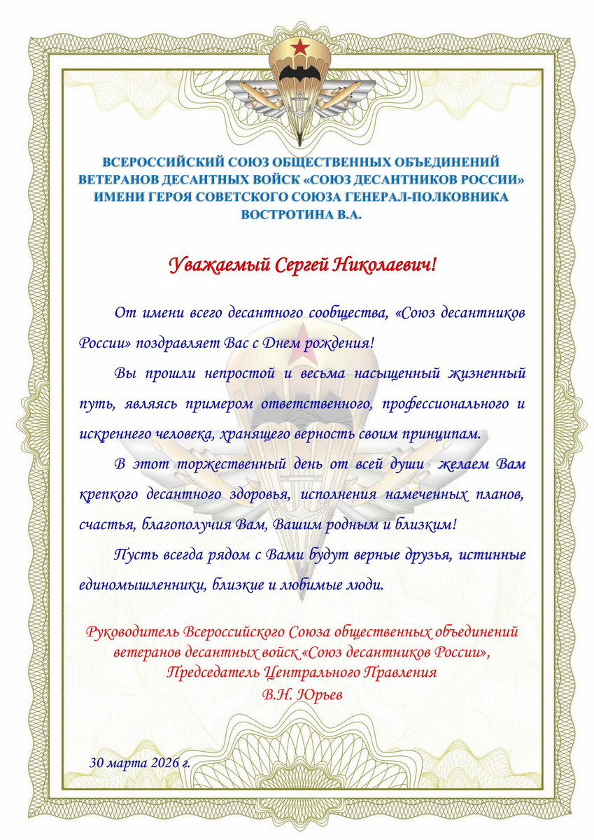 ВСЕРОССИЙСКИЙ СОЮЗ ОБЩЕСТВЕННЫХ ОБЪЕДИНЕНИЙ ВЕТЕРАНОВ ДЕСАНТНЫХ ВОЙСК «СОЮЗ ДЕСАНТНИКОВ РОССИИ» ИМЕНИ ГЕРОЯ СОВЕТСКОГО СОЮЗА, ГЕНЕРАЛ-ПОЛКОВНИКА ВОСТРОТИНА В.А.