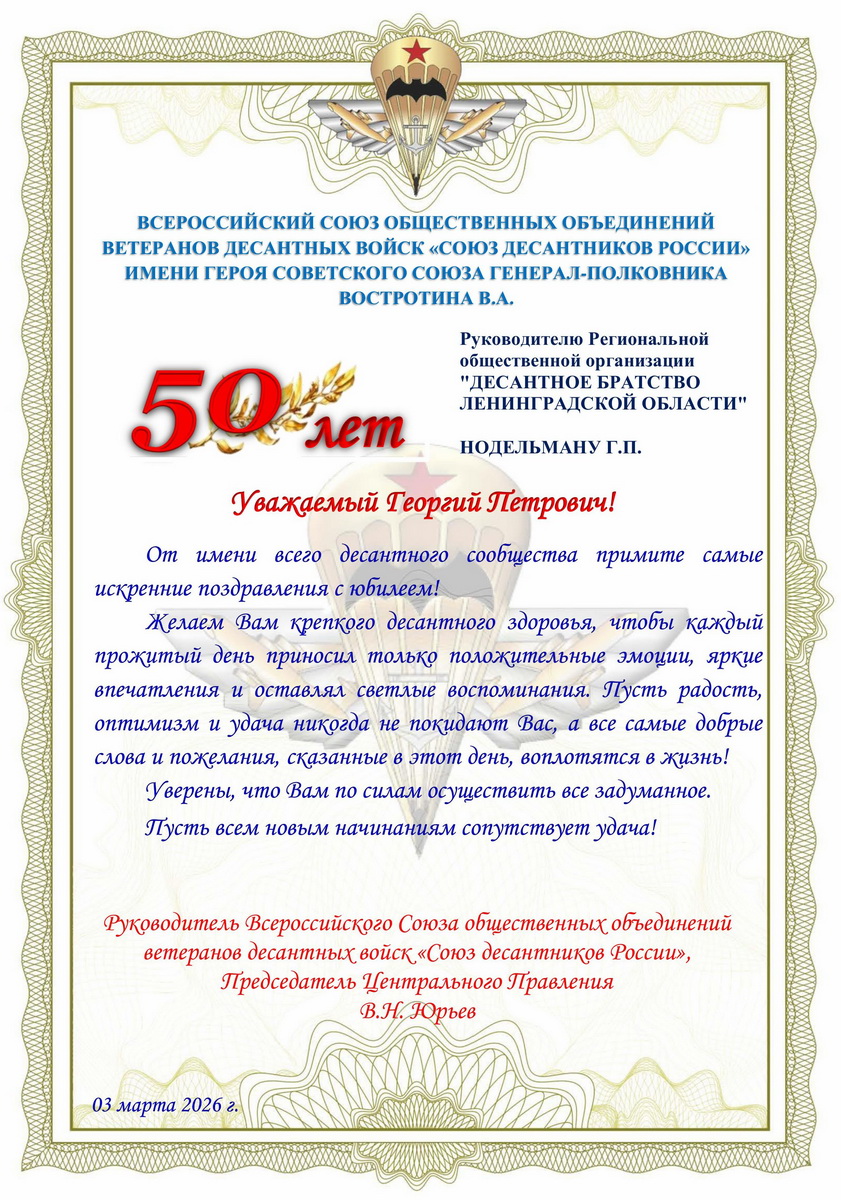 ПОЗДРАВЛЯЕМ С ЮБИЛЕЕМ! Руководителя Региональной общественной организации "ДЕСАНТНОЕ БРАТСТВО ЛЕНИНГРАДСКОЙ ОБЛАСТИ" НОДЕЛЬМАНА Георгия Петровича!