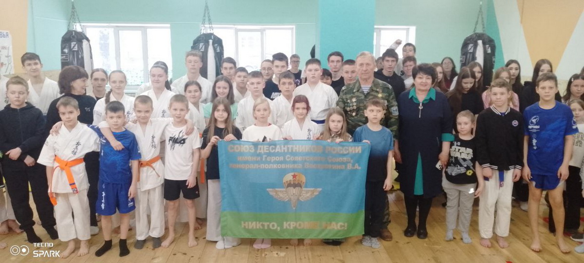 Ветераны-десантники рассказали вкратце о структуре и родах войск Вооруженных Сил РФ. Вместе с ребятами обсудили героические страницы истории. Поговорили о чести и любви к Родине. Ознакомили детей со знаками различия на погонах военнослужащих, изучили устройство АК-74. Ребята попробовали неполную сборку и разборку автомата, а самые активные сделали это на время. Также все ребята отработали норматив одевания противогаза.