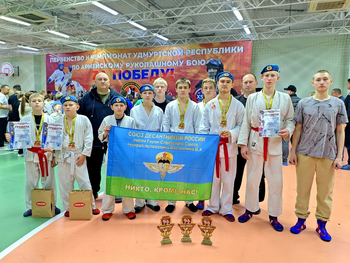 25 октября юные спортсмены военно-патриотического клуба «Десантник имени Руслана Шаймарданова» приняли участие в Первенстве Удмуртской Республики по армейскому рукопашному бою, посвященному памяти земляков, погибших в ходе СВО на Украине «Zа Победу!». Соревнование, прошедшее в городе Ижевск, стало частью рейтингового турнира Федерации армейского рукопашного боя Удмуртии «Пояс Чемпиона» (III этап).