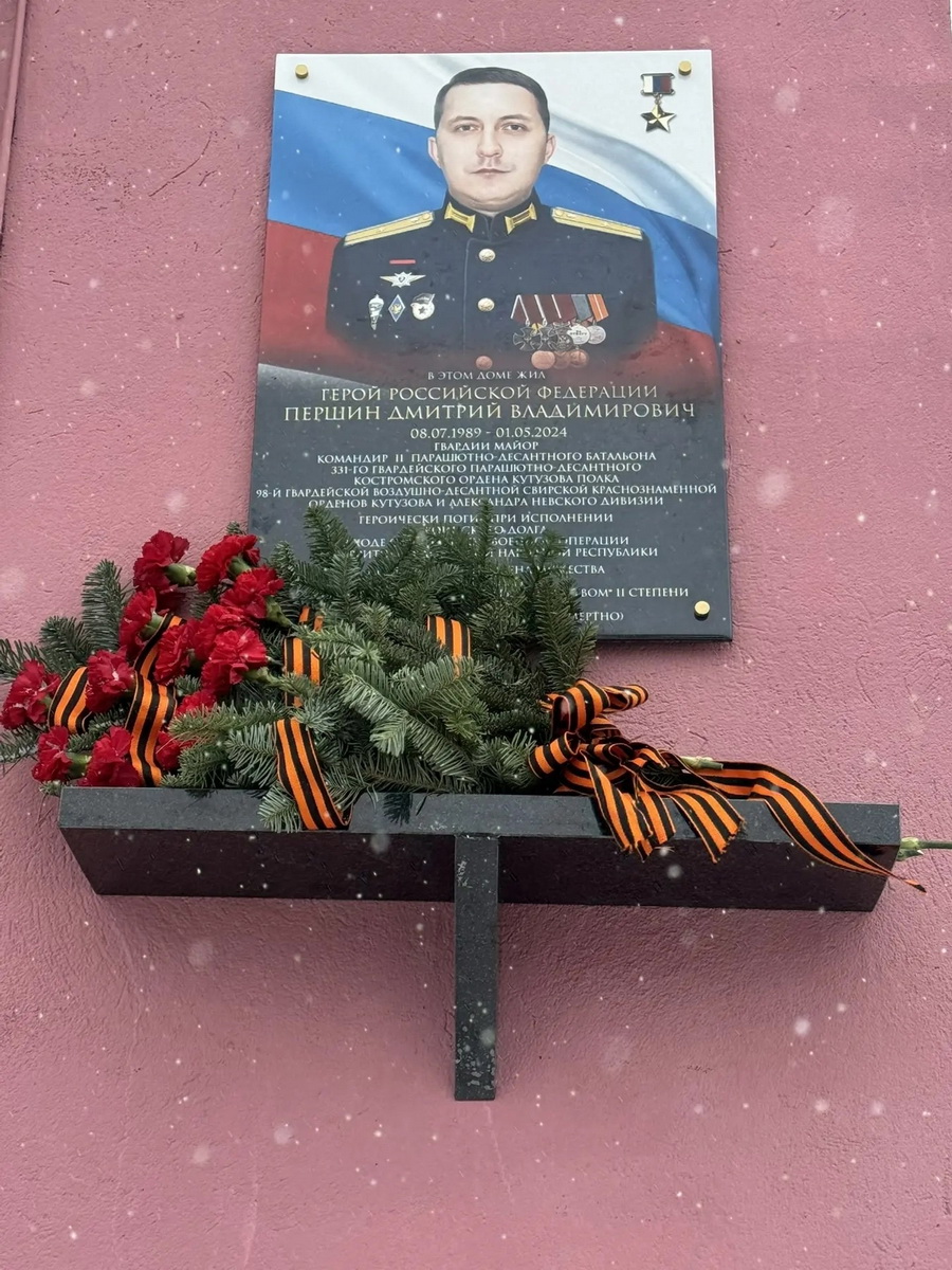 В Костроме в торжественной обстановке открыта памятная доска Герою России гвардии майору Дмитрию Владимировичу Першину. Памятный знак установлен на улице Галичской на фасаде дома № 45, в котором жил Герой России, погибший при освобождении Донецкой народной республики.