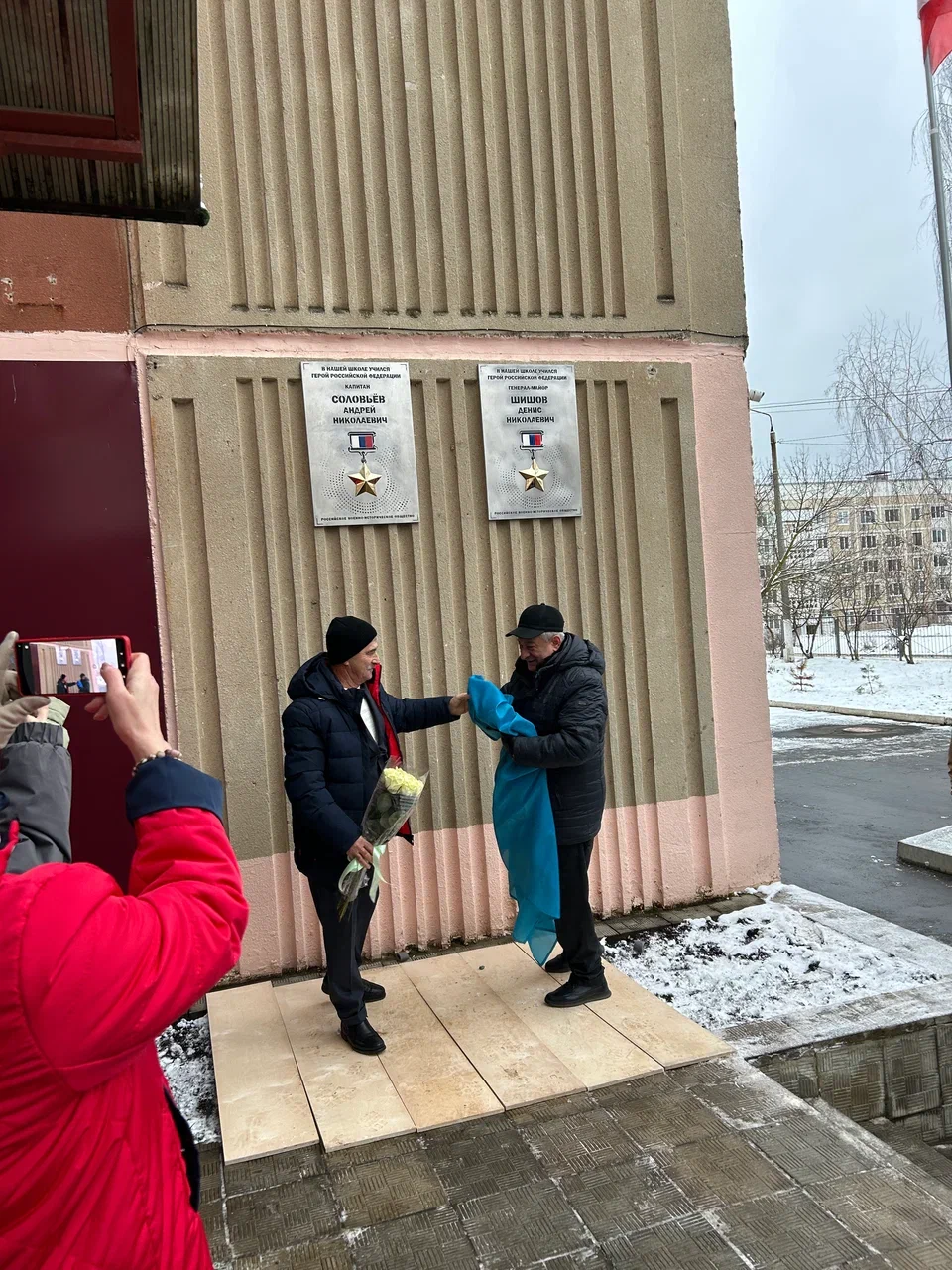 Почетное право открыть памятные доски было предоставлено директору школы Шахваранову Виталию Исмаиловичу и представителю КООО «Ветераны десантных войск» — отцу Дениса Шишова — гвардии старшему прапорщику в отставке Шишову Николаю Ивановичу.