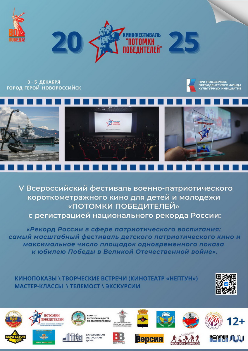 В городе-Герое Новороссийске с 3 по 5 декабря 2025 года проводится V Всероссийский фестиваль военно-патриотического короткометражного кино для детей и молодёжи «ПОТОМКИ ПОБЕДИТЕЛЕЙ», с регистрацией национального рекорда России.